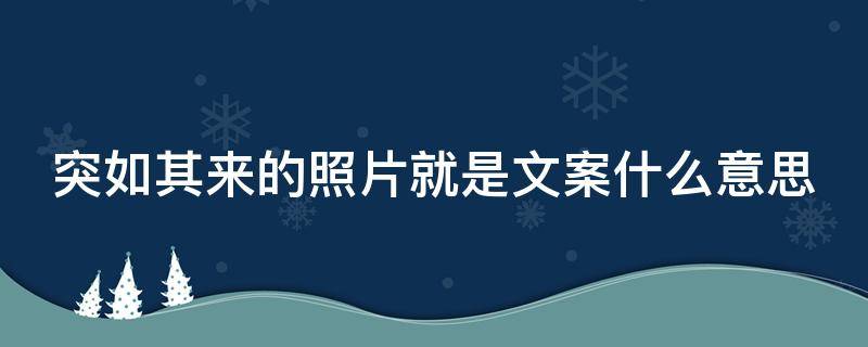 突如其来的照片就是文案的意思是出乎意料地突然出现的照片,就是最好的创意策略。突如其来指的是出乎意料地突然发生,出自《易离》:突如其来如,焚如死如弃如。文案本意是指放书的桌子,后来指在桌子上写字的人。现代指的是公司或企业中从事文字工作的职位,就是以文字来表现已经制定的创意策略。文案是一个与广告创意先后相继呈现的表现过程、发展过程与深化过程,多存在于广告公司、企业宣传与新闻策划工作等。