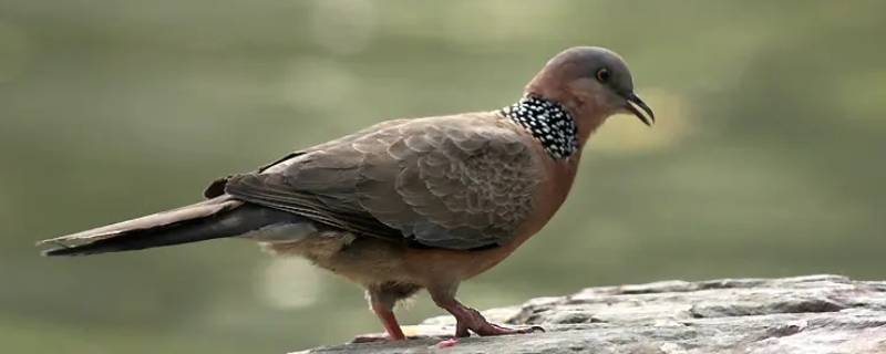 珠颈斑鸠主要以植物种子为食,特别是农作物种子,如稻谷、玉米、小麦、豌豆、黄豆、菜豆、油菜、芝麻、高粱、绿豆等。有时也吃蝇蛆、蜗牛、昆虫等动物性食物。通常在天亮后离开栖息树到地上觅食,觅食活动多以早晨7-9时和下午3-5时较为活跃。