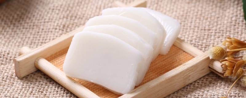 1、将年糕放在菜板上,用菜刀将年糕切成片;