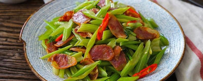 热锅,下入腊肠中火煎出油,出油后,倒入腊肠煸炒至芹菜至熟。
