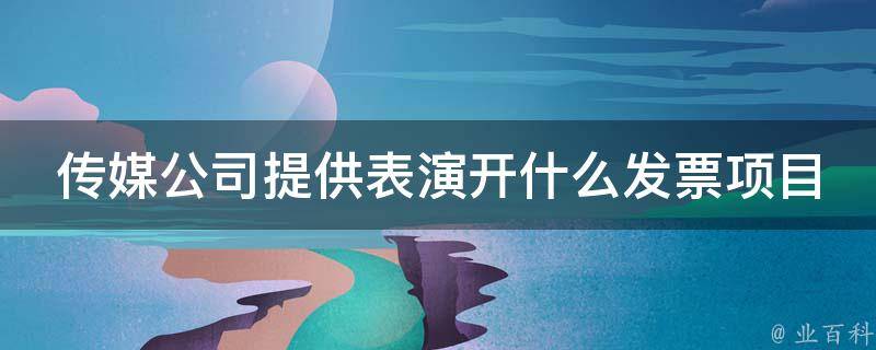 传媒公司提供表演开活动费发票项目。此外,如果涉及到租赁设备等,也可以开租赁费发票。同时,根据不同的服务内容,还可以开具如设计、制作费发票、展览展示费发票、咨询费发票、服务费发票等。