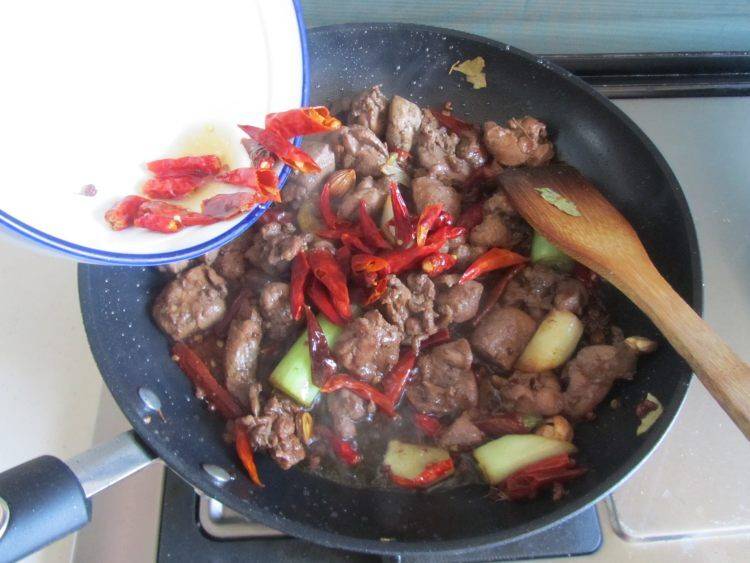10、加入准备好的大料和一半辣椒小火慢慢煸炒。
