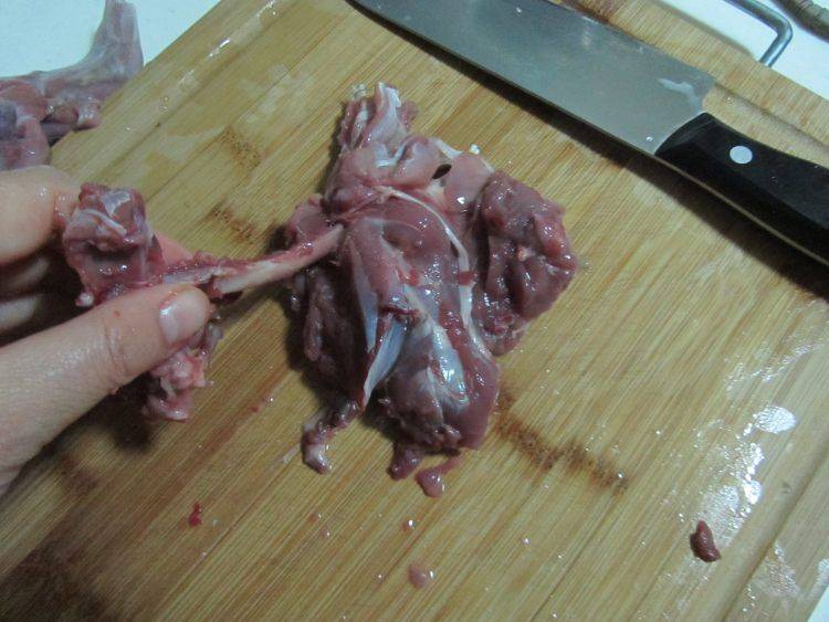 2、将泡好的野兔拿出解刀去骨。