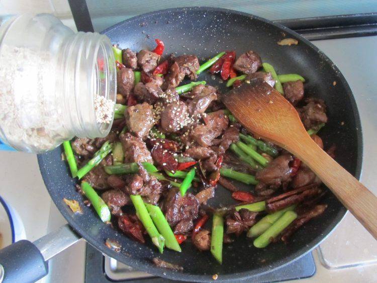 15、继续翻炒至基本成熟后再加入芦笋段翻炒均匀。