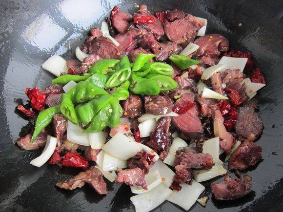 1、食材:熏马肠、洋葱、青辣椒、辣皮子、花椒粒、酱油、植物油、鸡精。
