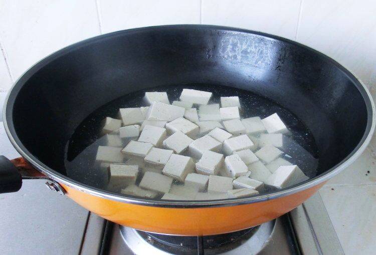 4、放入加了少许盐的沸水中汆一下,去除豆腥味,捞出用清水浸泡。