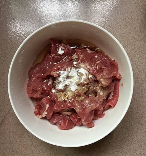 3、加入生抽,料酒,生粉,少量的盐和食用油,用手抓匀后腌15分钟。
