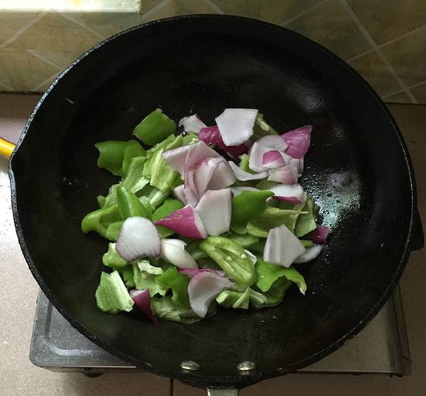 用料:牛里脊肉220克、绿辣椒200克、洋葱60克、生抽酱油10毫升、蒸鱼豉油10毫升、料酒10毫升、生粉2克、生姜5克、精盐3克、原味鲜1克、食用油30毫升。