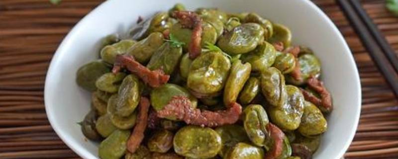 4、倒入煮好的胡豆,炒至外皮微干。