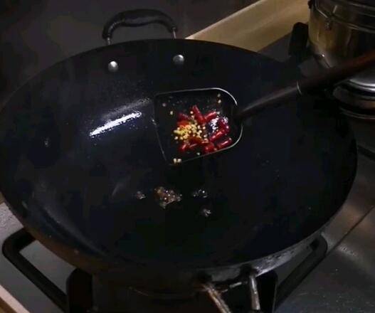 3、油锅中放油,油热后放入花椒粒和干辣椒,炒香。