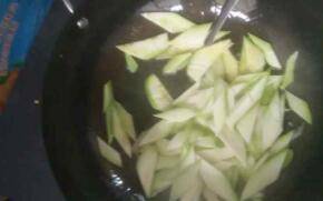 牛腿瓜洗净切块。热锅放油,少许大葱炝锅,待油温上升放入牛腿瓜翻炒。