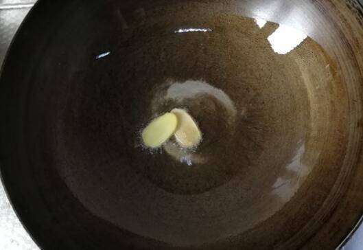 5、干净无水锅,开大火,倒入玉米油烧热,下姜片爆香。