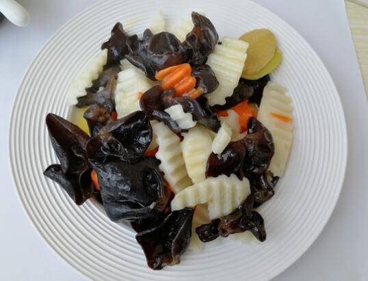 用料:山药1根、黑木耳一小碗、胡萝卜1段、姜片2片、玉米油30毫升、盐1勺、清水半碗、料酒3-5克。