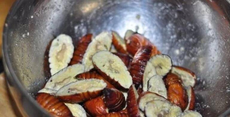 4、把蚕蛹切开两半,去掉黑心。