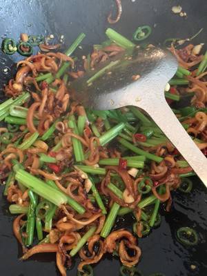 5、油热后下入墨鱼丝和姜,煸炒到微微卷曲。