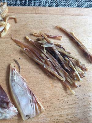 4、墨鱼切细丝,长一些,炒的时候会卷曲。