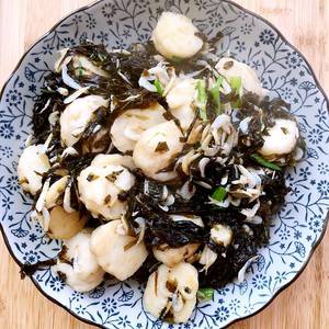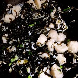 用料:墨鱼丸200g、紫菜2片、虾米1两、料酒20ml、油、盐适量。