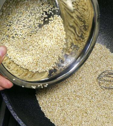 炒锅洗干净,开小火,把洗干净的芝麻倒在锅里,开始不断翻炒。