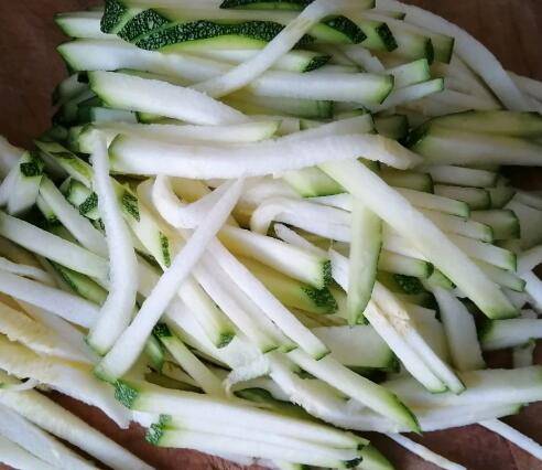 1、小南瓜清洗好,切片后切丝。