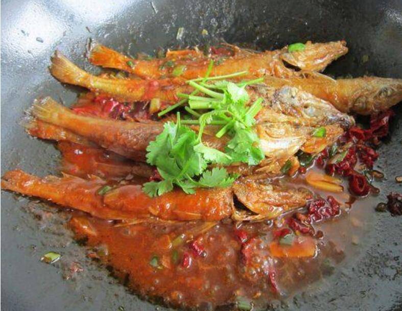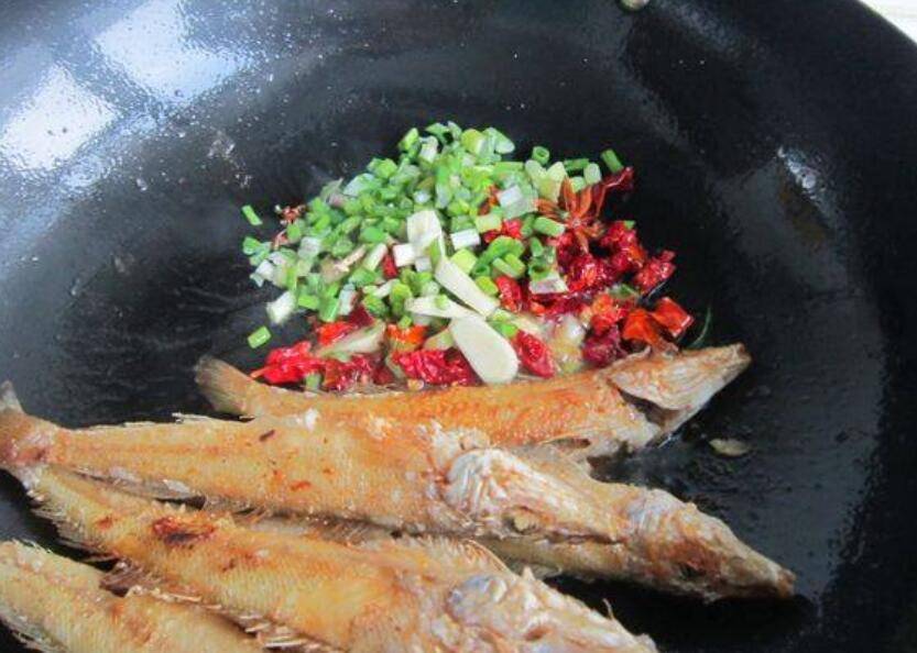 5、加葱段、蒜、姜片、花椒、八角、辣皮子、盐、炒出香味,把鱼和炒香的调料拌在一起。