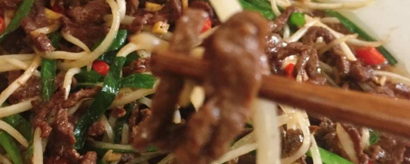 牛肉220g、绿豆芽150g、韭菜10棵、小米椒4个、生姜一小块、大蒜两头、生抽适量、老抽适量、白糖适量、生粉适量、油适量、黑胡椒适量、盐适量。