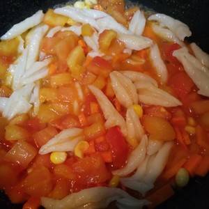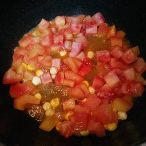 4、起锅放油,下切好的番茄丁和玉米,加一勺盐。放盐炒番茄,这样易出汁和沙。
