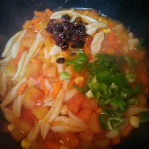 用料:西红柿1个、面粉100克、水适量、玉米、胡萝卜1小段、青椒1个、油适量、生抽1勺、牛肉酱1勺、盐适量。