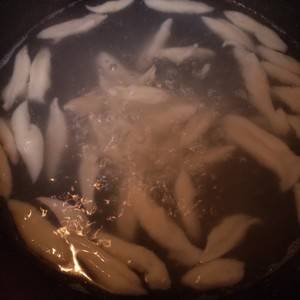 3、烧一锅开水,放一勺盐,用厨房剪刀把面团剪成小面疙瘩,煮至面疙瘩浮起,捞出来备用。