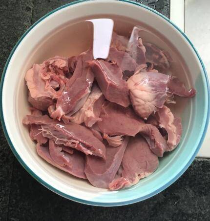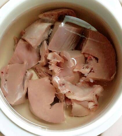 2、洗净后的猪心用水泡泡,稀释下残留的血。多换几次水,泡干净。