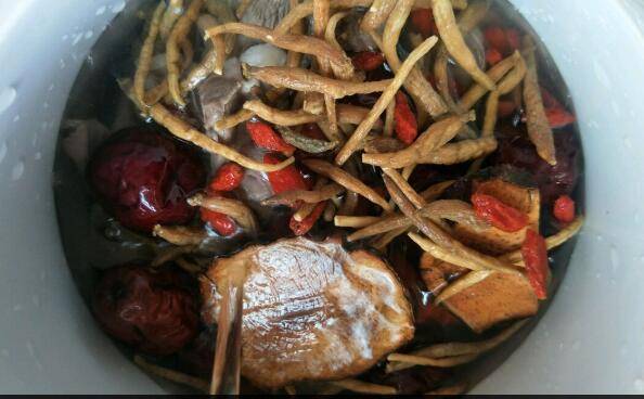 5、猪尾骨猪心放入汤盅,加入汤料,注入适量清水。