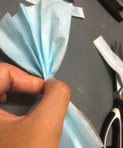 把中间剪出来的一部分慢慢一层层折起来,用口罩做蝴蝶结发卡。