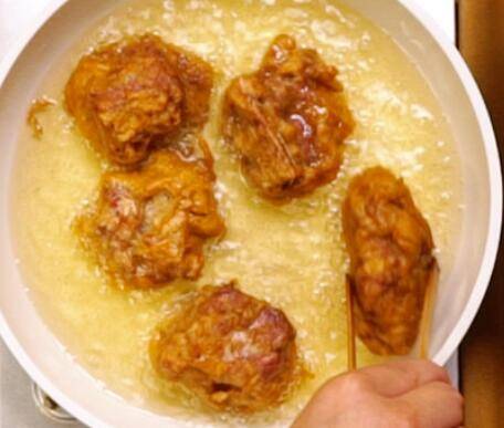 3、倒入食用油,大火烧至六成热,放入腌制好的排骨。