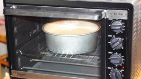 9、烤箱150度预热10分钟,然后将蛋糕模具放入烤箱倒数第二层(中下层)。