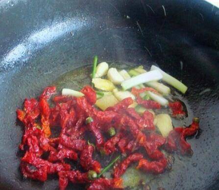 4、锅底留底油,加葱姜蒜、辣皮子、花椒粒炒出香味。