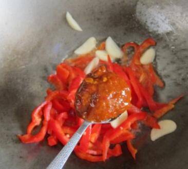 3、热油炒大蒜辣椒爆出香味,黄豆酱爆炒一下。