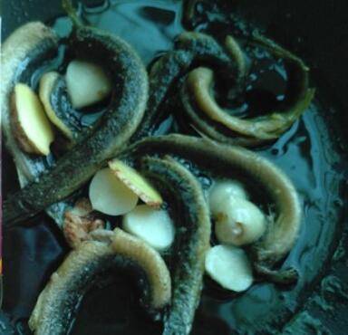 2、锅中倒油炒泥鳅去腥味,加姜、蒜、料酒炒香。