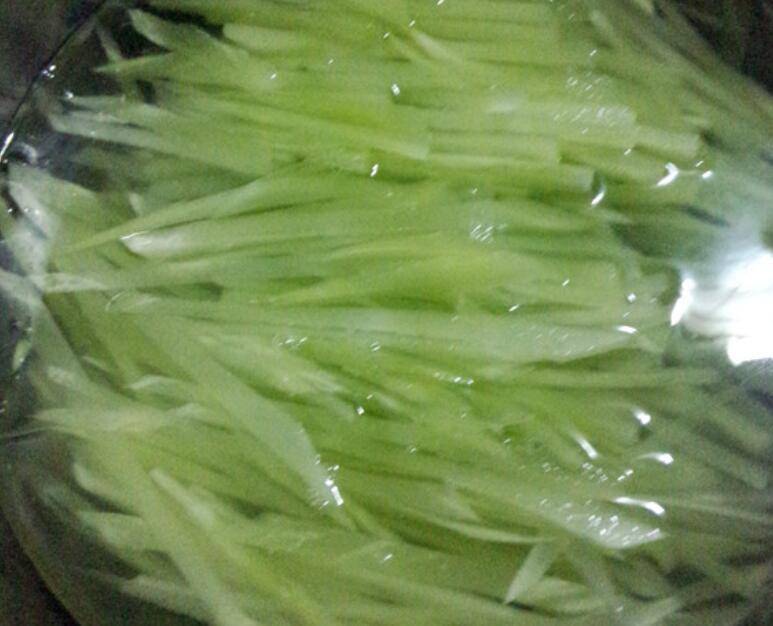 2、洗净后的莴笋,切成莴笋片;再改刀切成莴笋丝,浸泡在清水里,以免莴笋变色。