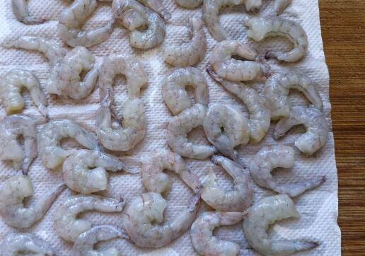 用厨房纸将水分吸干,将处理好的虾仁加一点淀粉和一点料酒抓拌均匀至上浆。