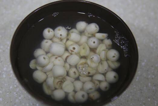 2、莲子泡软煮熟备用。