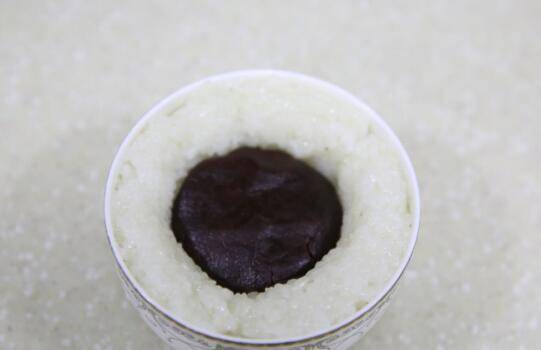 7、碗里抹一层猪油防沾,碗底用枣和果干摆上自己喜欢的造型。