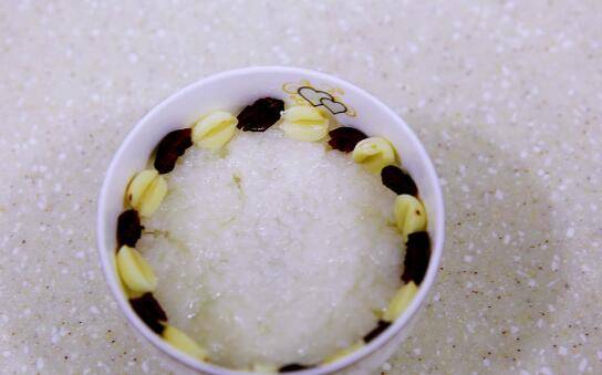 9、在糯米饭上沿着碗的边缘摆上莲子和蔓越莓。