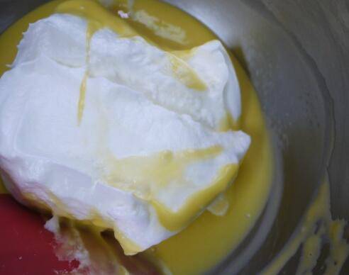 把混合均匀的蛋黄糊倒入剩余的蛋白霜中,快速翻拌均匀。