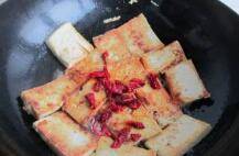 6、煎好的香干加入辣子皮、盐、味级鲜和少许的水,一起焖一会入味。