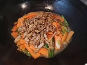 8、肉丝盖在胡萝卜上,盖上锅盖,中火煮3分钟。