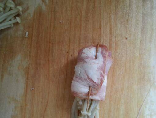 4、一整条培根从中间切开,卷入少许金针菇后用牙签固定住。