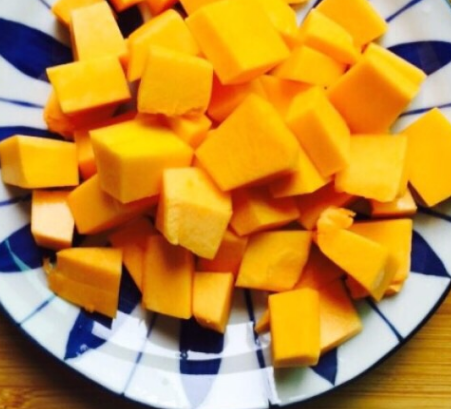 1、将南瓜去皮,去掉南瓜馕冲洗一下。切成块状,装盘备用。