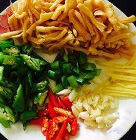 5、萝卜干切段,杭椒和小红辣椒滚刀切、大蒜拍碎切颗粒,姜切丝、青蒜切小段。