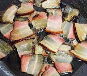 6、油下锅,将沥干水分的腊肉完全煸出油,然后捞起,装盘备用。