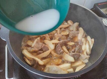 下入鸡腿菇,高汤也一并倒入锅内,再次炒匀。