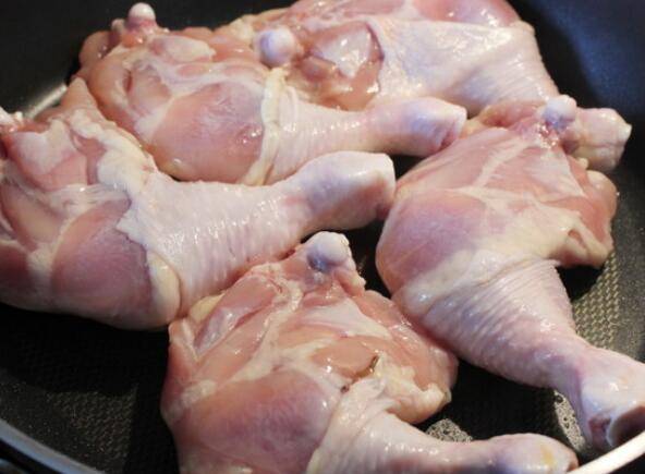 锅热倒油将鸡腿皮朝下,用中火煎。